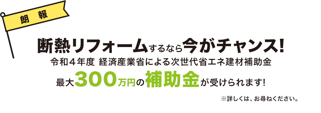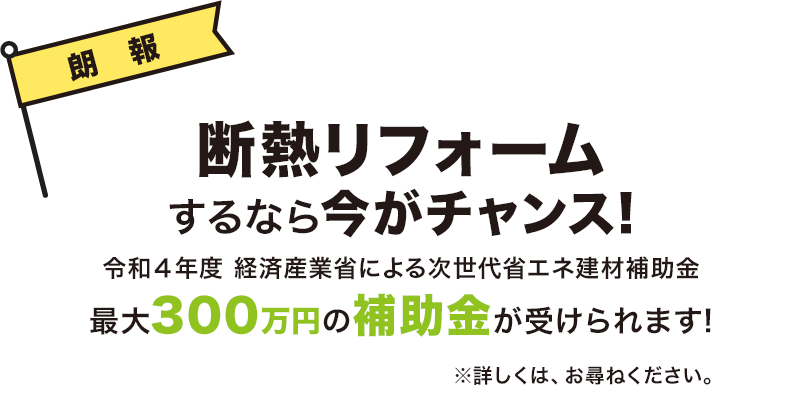 まだ住宅ローンを 住宅ローンを返済中の方でも、リフォーム費用を加え、新たに低金利の住宅ローンに借り換えすることが可能です。 最大300万円の 令和4年度 経済産業省による次世代省エネ建材補助金事業が活用できます。 ※詳しくはお問い合わせください。 |