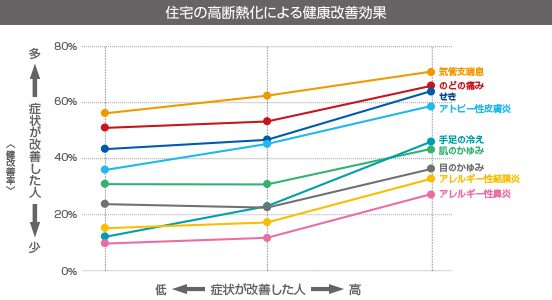 住まいの高断熱化と健康改善の関係を研究した調査データがあります。その結果、断熱性の高い住宅に住み替えた人の方が、気管支喘息やアトピー性皮膚炎など、健康を害する諸症状が出なくなったという割合が多いことがわかりました。特に、気管支喘息やのどの痛み、せき、アトピー性皮膚炎における改善率の高さは注目に値します。 |