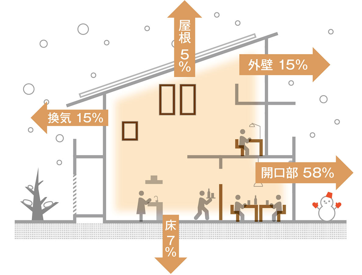 暖かさが逃げる73%は開口部や壁からです。 (一社)日本建材・住宅設備産業協会 省エネルギー建材普及促進センター |